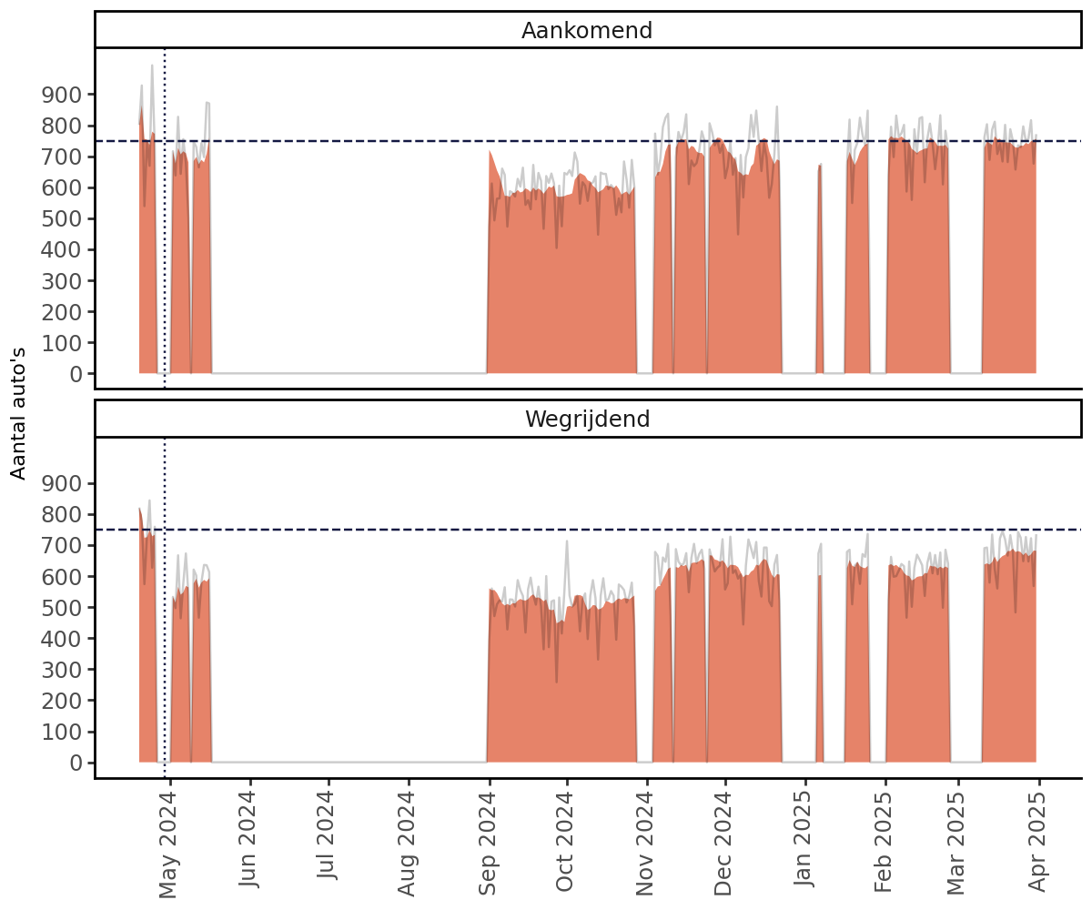 Op de visualisaties staat een verticale stippelijn die de datum dat het mobiliteitsplan werd ingevoerd weergeeft.