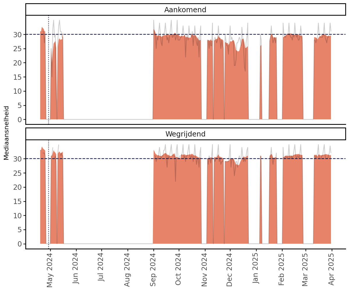 Wat ook opvalt in de metingen: de snelheid lijkt niet drastisch gewijzigd te zijn. Als ge alle auto’s ordent volgens hoe snel ze het meetpunt voorbijreden, en ge pakt de middenste, dan berekent ge de mediaan. Hoewel er initieel een daling van die mediaansnelheid te zien is, herstelt zich dat doorheen het jaar, met enkele uitzonderingen: