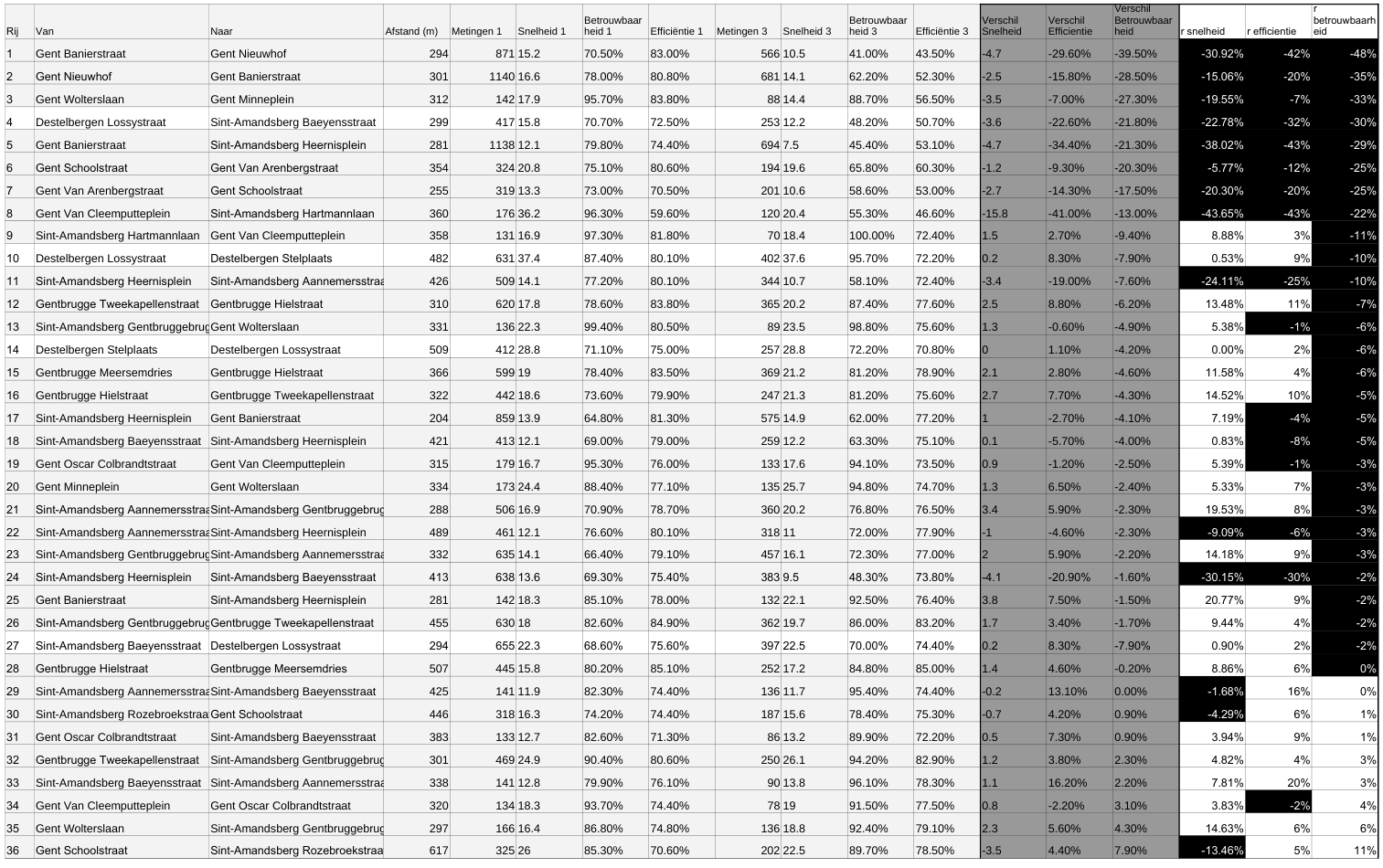 Ook De Lijn heeft beschikbare cijfers. Zij voerden drie metingen uit. In de onderstaande tabel wordt de eerste en de laatste meting vergeleken voor 18 haltes, in beide richtingenм tijdens de avondspits. De procentuele verschillen1 zijn te vinden in de laatste drie kolommen, en dat voor de verschillende indicatoren2.
