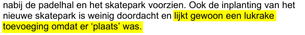 Meer nog, in plaats van die gedecentraliseerde visie door te trekken, besloot men als kers op de taart in de beroepsfase om nog een skatepark toe te voegen. Ook daarover had de provinciale ambtenaar iets te zeggen: