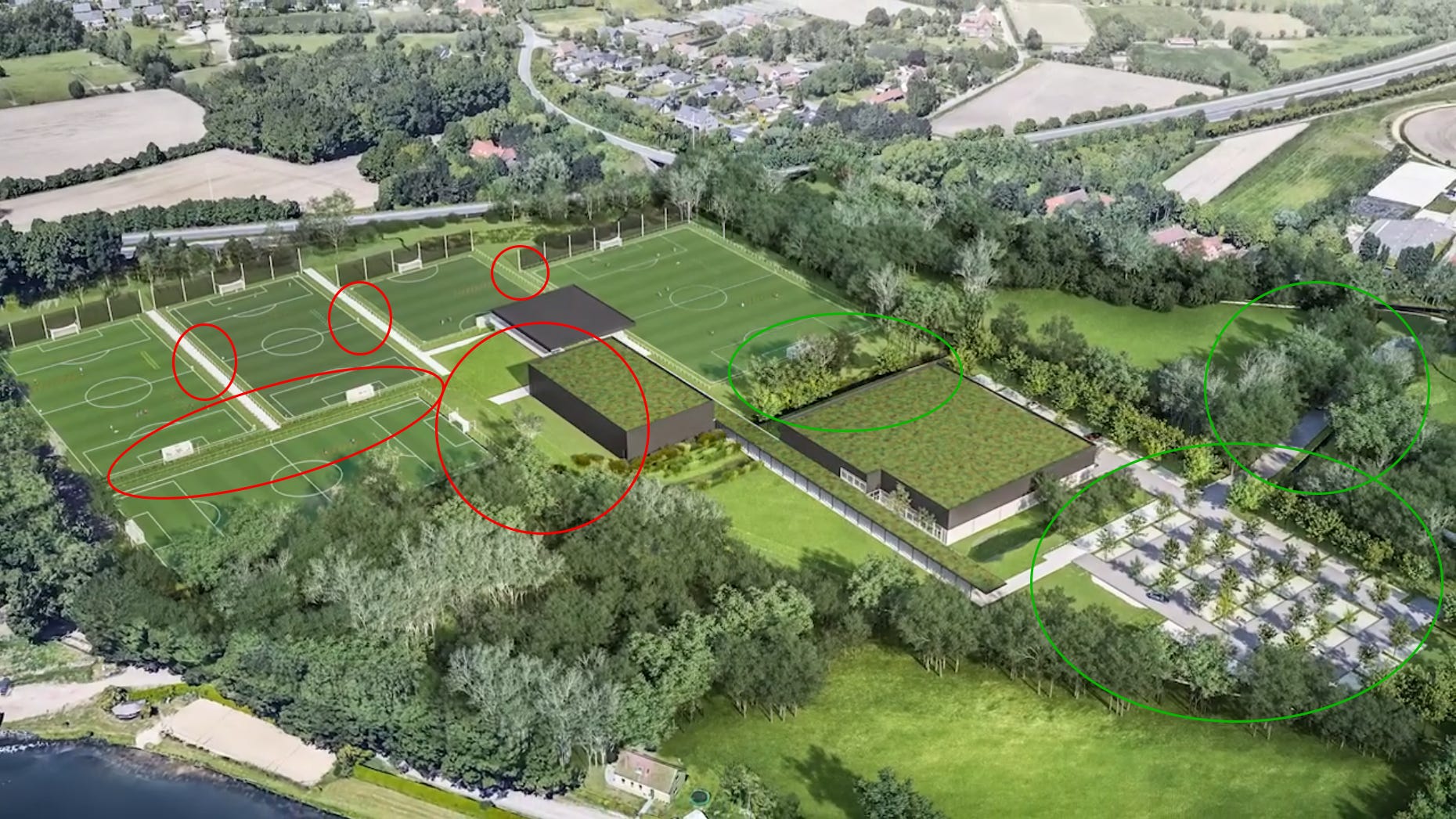 Dat wordt duidelijk op de 3D-beelden die gemaakt werden ter promotie van de site: veel groen rond de site, maar nagenoeg niks tussen de voetbalvelden of de gebouwen.