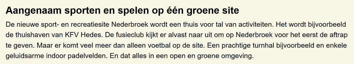 Ge moet waarschijnlijk onder een steen hebben geleefd als ik nu met de deur in huis val: maar de Nederbroeken-site, met vijf kunstgrasvoetbalvelden, tribune, acht padelvelden, turnzaal en parking komt er niet.