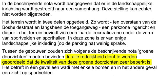 De provinciaal omgevingsambtenaar schrijf hierover dat er van die groene doorzichten maar weinig te merken is. Hoewel de site omringd wordt door bomen, en er een parkje aangelegd wordt, is er op de rest van de site eigenlijk geen groen aanwezig: niet tussen de gebouwen, niet tussen de voetbalvelden.