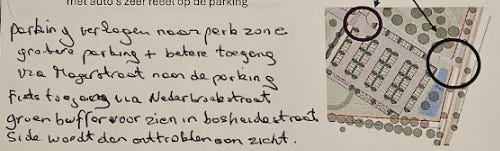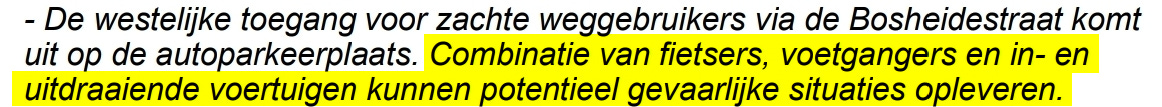 Ook schreef ik over het argument van de Fietsersbond dat het combineren van fietsverkeer & autoverkeer in de oprijlaan en op de parking gevaarlijk is. En dat het omwisselen van de parking en de groene zone een uitstekende suggestie was, waardoor auto’s en fietsers grotendeels gescheiden worden van elkaar.