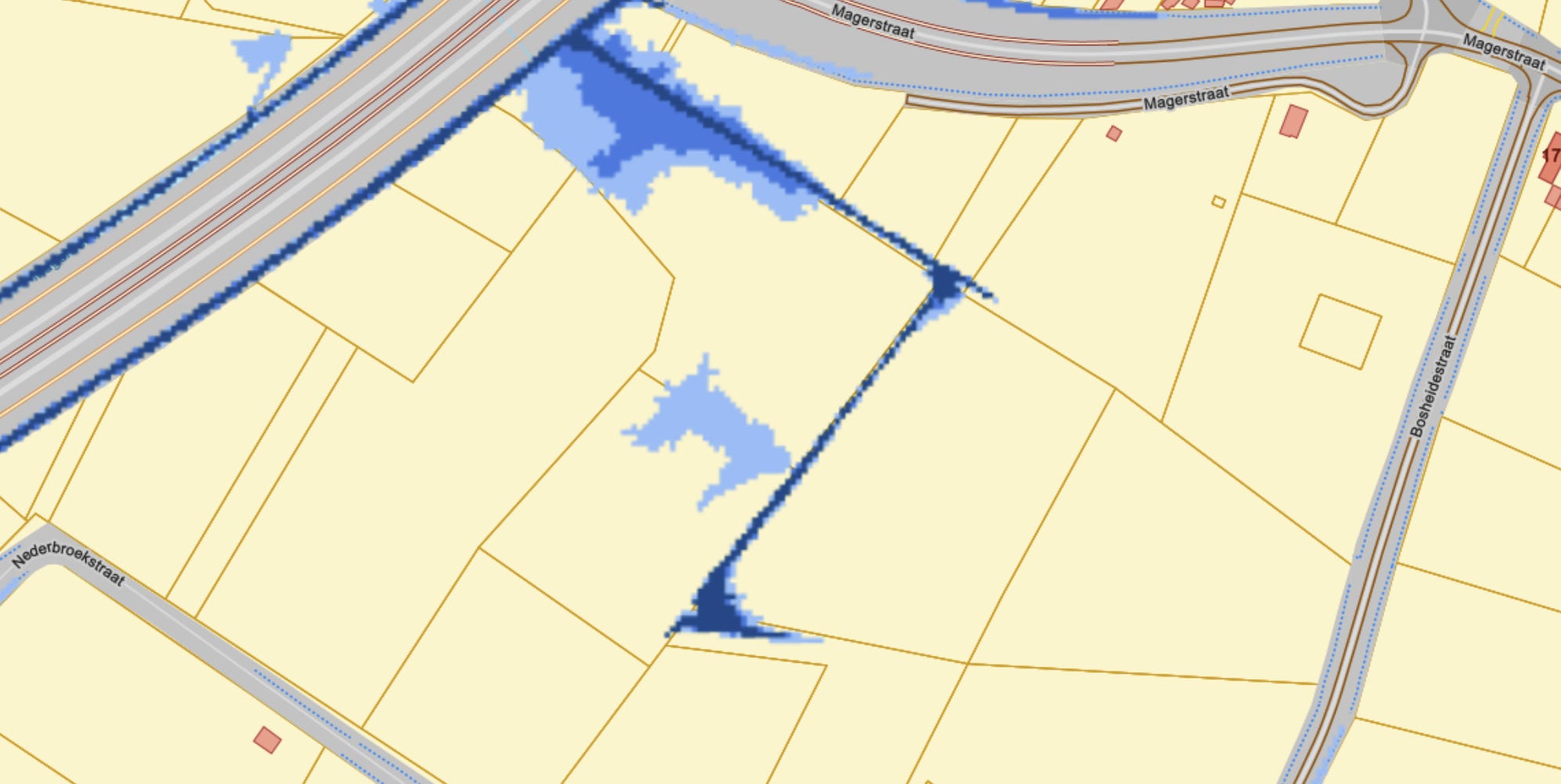 Ik weet niet of ge in het tussenseizoen al eens op die akker zijt gaan rondlopen, maar dan is dat daar een drassig boeltje. En dat wordt ook bevestigd in het advies (19 maart 2025) dat door de Dienst Integraal Waterebeleid werd afgeleverd ihkv het beroep. Daar stond te lezen dat het gebied zich in pluviaal overstromingsgevoelig gebied ligt: dat wil zeggen dat het kan overstromen als het eens goed regent. Zeker die grachten die door de site lopen kunnen problematisch zijn.