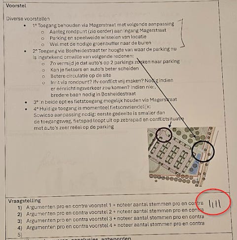 En tot slot nog vier stemmen voor het omwisselen van parking en speelweide.