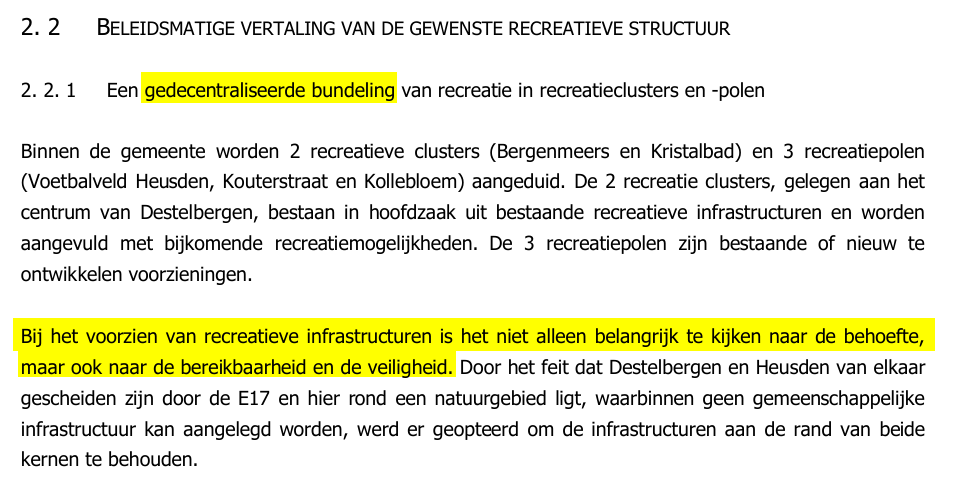 En het decentraliseren van de verschillende sportfaciliteiten, in plaats van ze te clusteren in een moeilijk te bereiken monstersite, is dan ook in lijn met het gemeentelijk ruimtelijk structuurplan (GRS) dat tot vandaag nog steeds van kracht is.