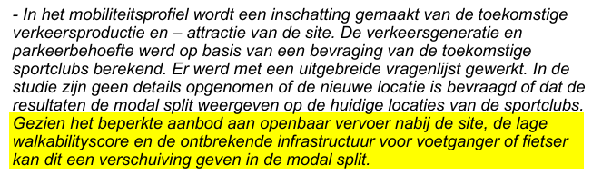 Eind vorig jaar, nog voor de vergunning werd toegekend, schreef ik al dat de gebruikte parameters in de mobiliteitsstudie (MOBER) wel erg ambitieus zijn. De helft van de voetballers van KFV Hedes zou met de fiets komen, en turnclub Athena zet vollenbak in op carpooling. Gezien de gevaarlijke fietsroutes naar de site en de complete afwezigheid van openbaar vervoer leek me dat sterk.