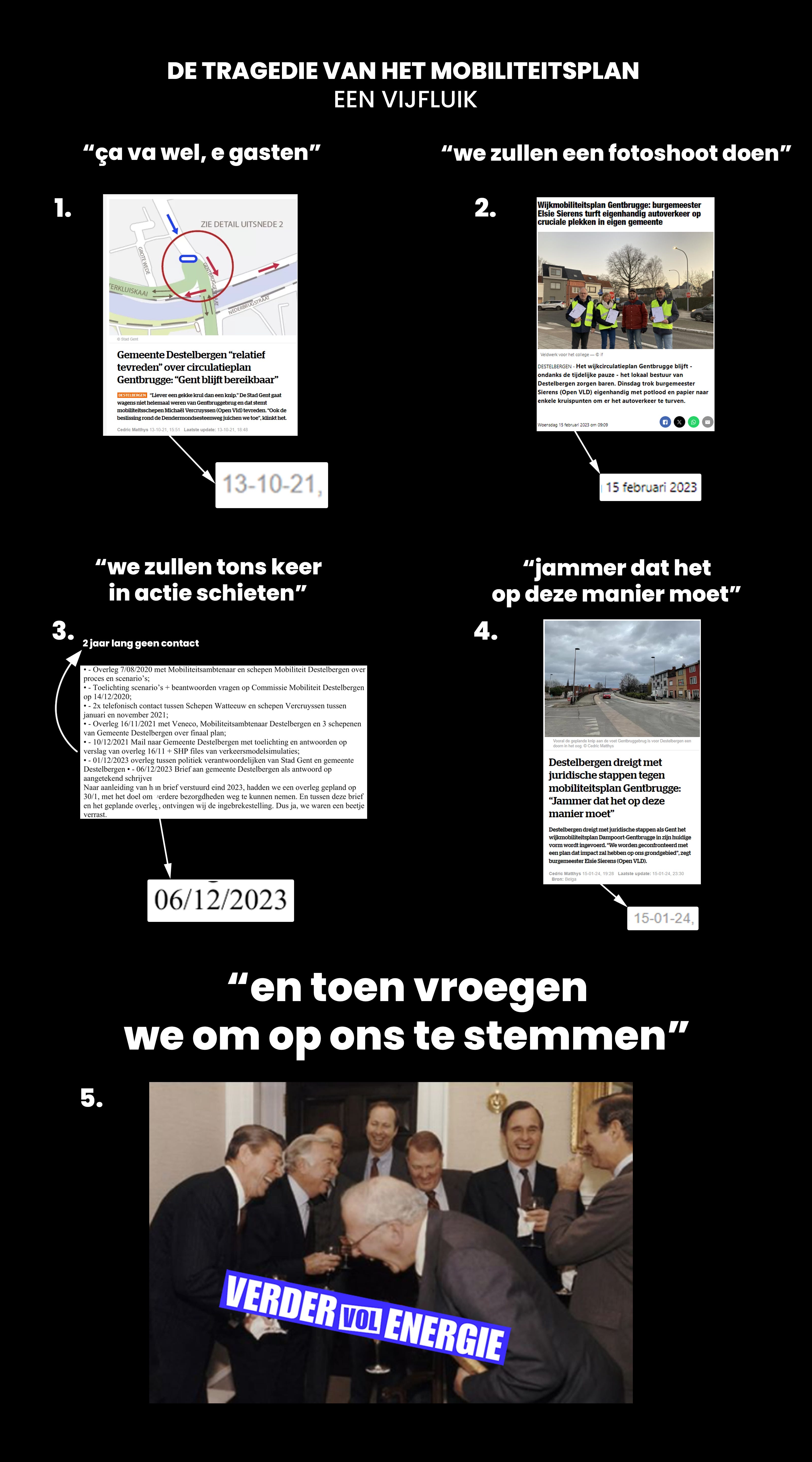 Ten slotte zijn er wel meerdere dossiers waar het Gemeentebestuur toonde dat ze andere prioriteiten heeft dan mobiliteit: als het gaat over openbaar vervoer, of het veilig inrichten van de verbindingsweg tussen Heusden en Destelbergen (een dossier dat al meer dan 10 jaar aansleept) of de reactie op de ludieke actie van de Fietsersbond.
