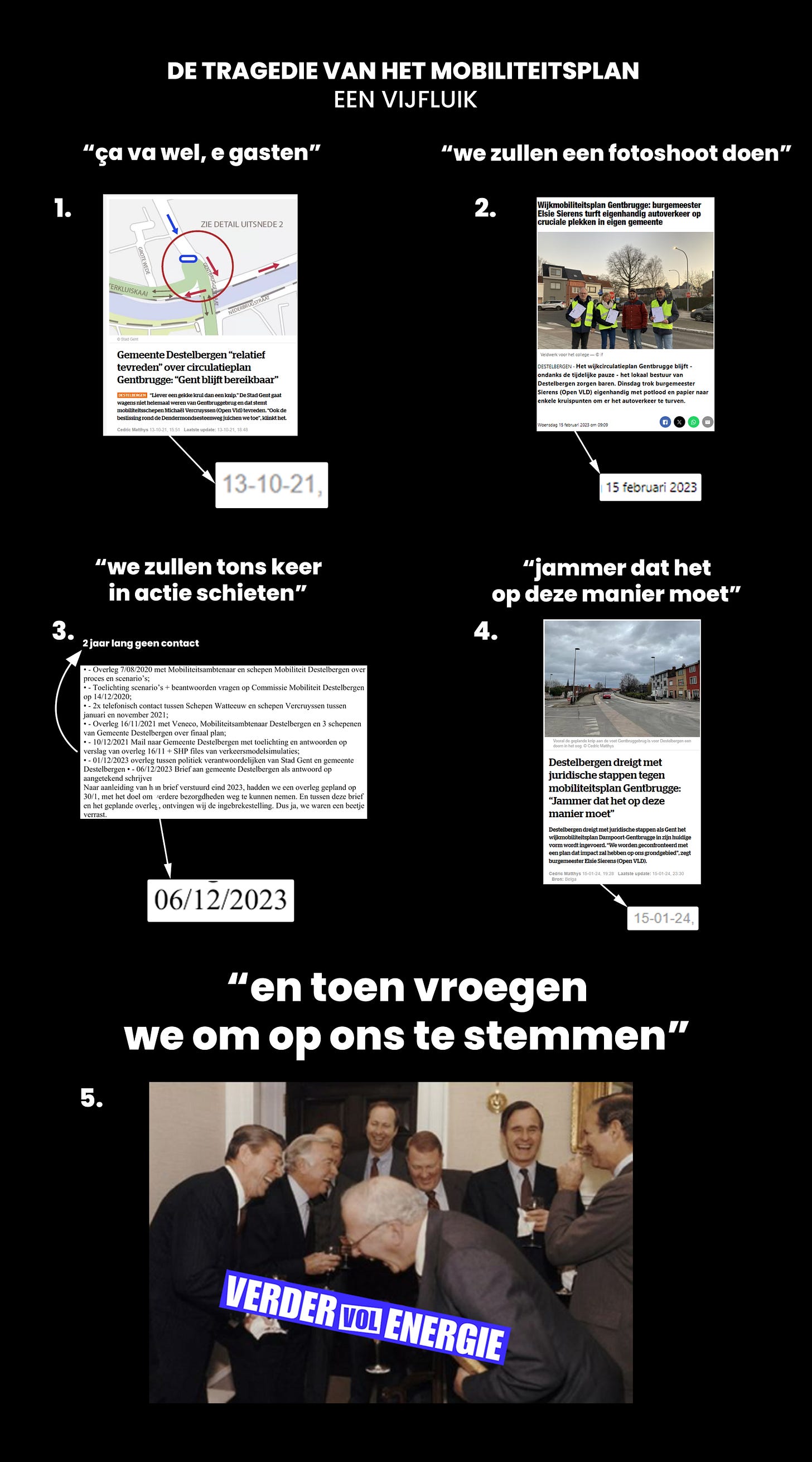 Als ge de tijdlijn tot eind 2023 bekijkt kunt ge inderdaad niet anders concluderen. Uit een vraag op de Gentse Gemeenteraad van raadslid Anneleen Van Bossuyt (N-VA) weten we dat er twee jaar lang (!) geen officieel contact is geweest tussen beide gemeentes. Ook in de besluiten van het Destelbergse college of de gemeenteraad is er niets terug te vinden.