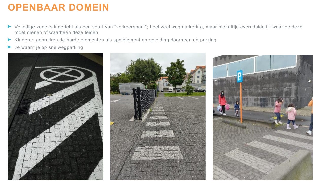 Hoewel men in de handelskernen reeds een parkeerschijf moet leggen (blauwe zone) om te parkeren, geeft dit het recht om tot twee uur lang op dezelfde plek geparkeerd te staan. Door dit in te korten (30’) hoopt men meer parkeerplaats te creëren voor mensen die uit-en-in de auto willen springen om een brood te kopen. Impliciet geeft men hiermee toe dat weinigen nog naar de handelskernen gaat, om daar te vertoeven en inkopen te doen, maar dat men het daar vooral moet hebben van passerend verkeer.
